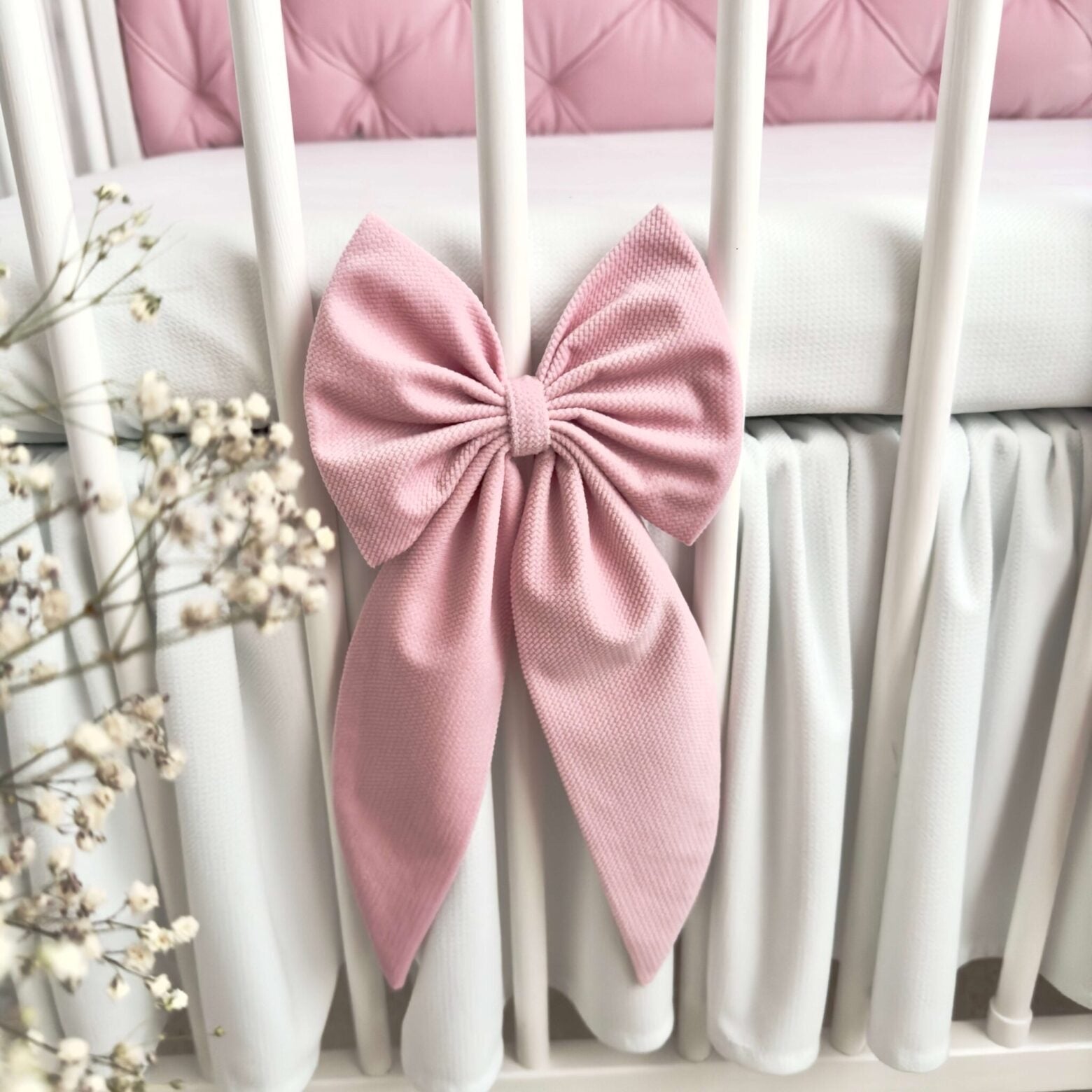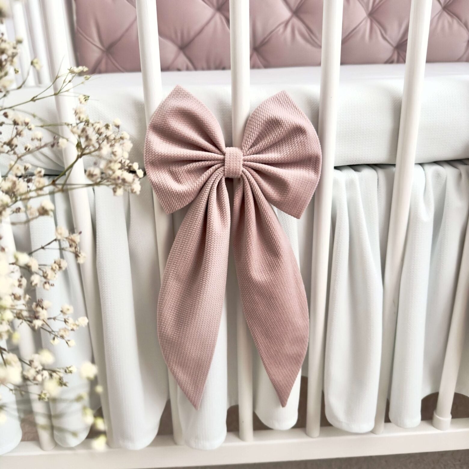 Unsere handgemachte Dekoschleife aus edlem Velvet ist das perfekte Accessoire für ein liebevoll gestaltetes Kinderzimmer. Ob am Babybett, an Vorhängen oder an der Wand – sie verleiht jedem Raum eine warmherzige, stilvolle Atmosphäre.